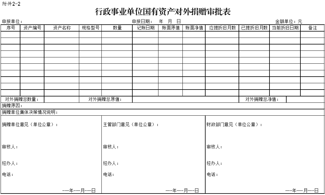 2.《行政事業(yè)單位國有資產(chǎn)對外捐贈審批表》;